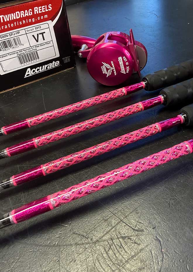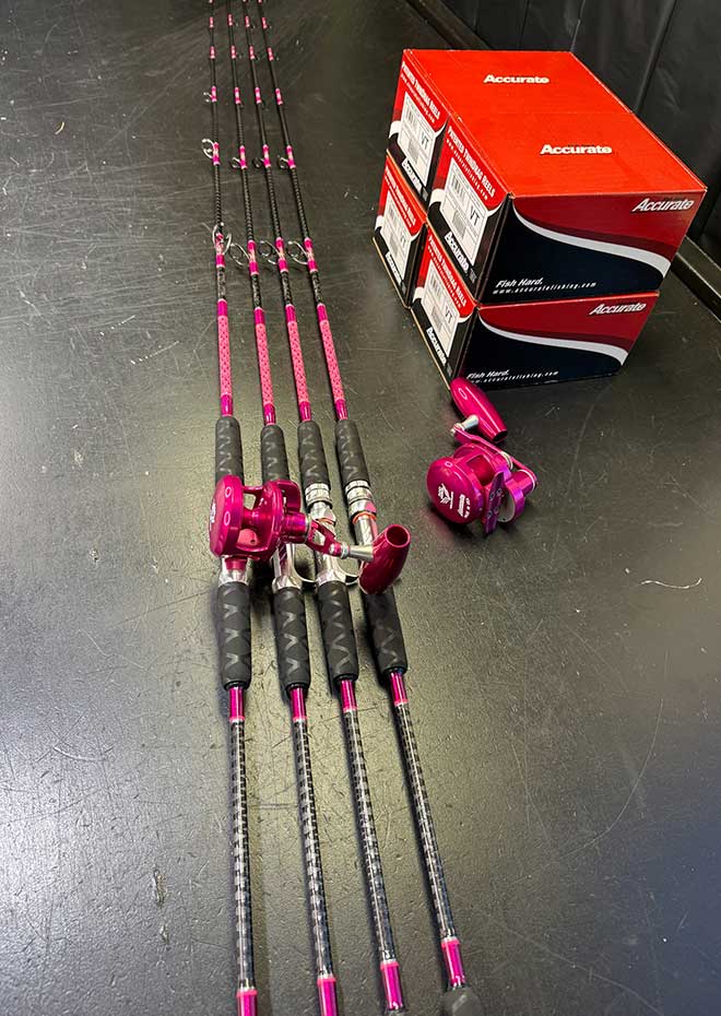 The Platinum Slow Pitch Conventional Rod delivers precision, power, and balance in a sleek limited-edition Pink build. Rated for 200–300g jigs, this 7' all-carbon rod is finished with ALPS reel seats and a rear split grip for maximum comfort and control. Complete the look with the custom hot pink Accurate Valiant 2 500 Narrow Slow Pitch reel—a flawless match built for serious slow pitch anglers.